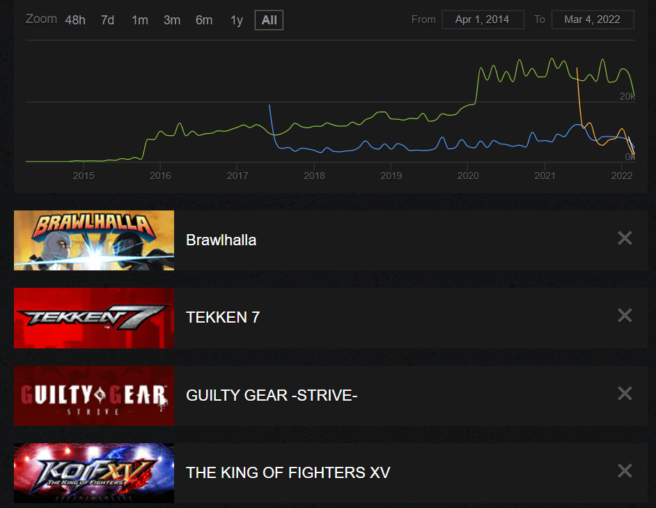 Brawlhalla, even though it’s rather limited in its technical aspect, runs well, has a good netcode and isn’t inherently P2W (however I recall the time when everyone played Wu Shang out of necessity, as he was the best character in the game). The game relies on selling permanent access to heroes (there are usually some free heroes in a rotation) and vanity items. And it’s doing better than any other fighting game on PC, at least.