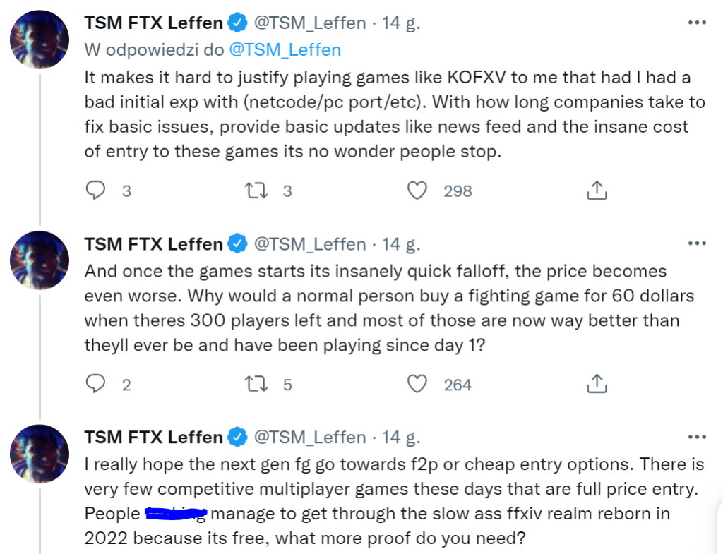 Leffen, one of the most prominent Super Smash Brothers Melee and Guilty Gear Strive players in the world, published a string of tweets a couple of months ago and they were as follows: