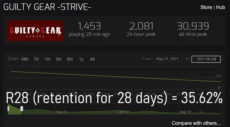 Guilty Gear Strive had 30 939 players on the 31st day of May during its release and it was the most players the game has ever had. A month later, on June 28th the game had 11 019 players. It means that the retention rate in this 28-day long span clocked in at R28=35.62%. This is not great, but also not extremely bad. I mean, it wouldn’t be bad if not a design choice that pretty much all fighting games abide by.